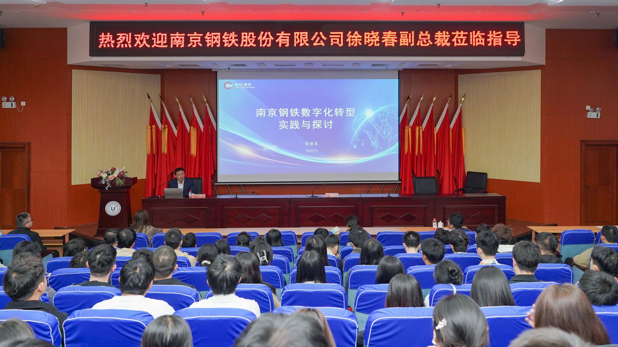 近日,pp电子官网卓越工程师学院首席专家讲坛开讲,首场讲座特邀南京钢铁股份有限公司常务副总裁徐晓春来校作《南京钢铁数字化转型实践与探索》专题报告。副校长谢刚主持,相关部门负责人、相关领域教师及150名“卓越工程师计划”研究生参加。