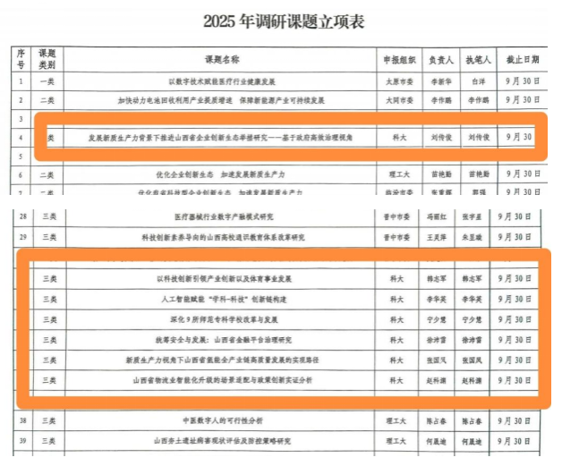 日前,九三学社山西省委员会公布了2025年参政议政重点调研课题评选结果,九三学社pp电子游戏平台官网委员会共获批7项课题,数量在全省各级基层组织中位列第二、高校组织第一,这是继2024年6项社省委课题立项基础上的又一次新突破。