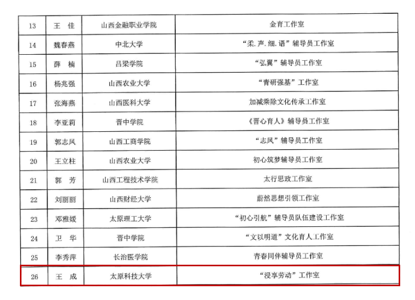 近日,山西省教育厅公布了2025年度山西省高校思想政治工作质量提升综合改革与精品建设项目名单,pp电子官网专职辅导员王成主持的“浸享劳动”工作室获批2025年度省级高校辅导员名师工作室,这是pp电子官网辅导员队伍建设和学生思政工作品牌化建设取得的又一重要成果。“浸享劳动”工作室成立于新时代五育融合和以劳育人的时代背景下,与pp电子官网劳动教育的变革发展同频共振,服务于学校劳动教育的整体性协同育人格局,进一步引导和转变数字时代...