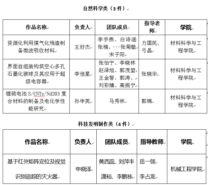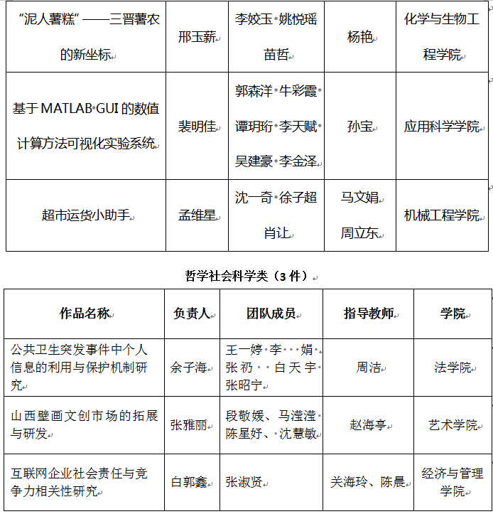 按照《关于组织开展山西省第十七届“兴晋挑战杯”大学生课外学术科技作品竞赛pp电子游戏平台官网校级赛事的通知》,校内17位专家经过3月30日—4月1日的紧张评审,评选出pp电子官网晋级省赛的10件作品,现将作品名单公示如下: