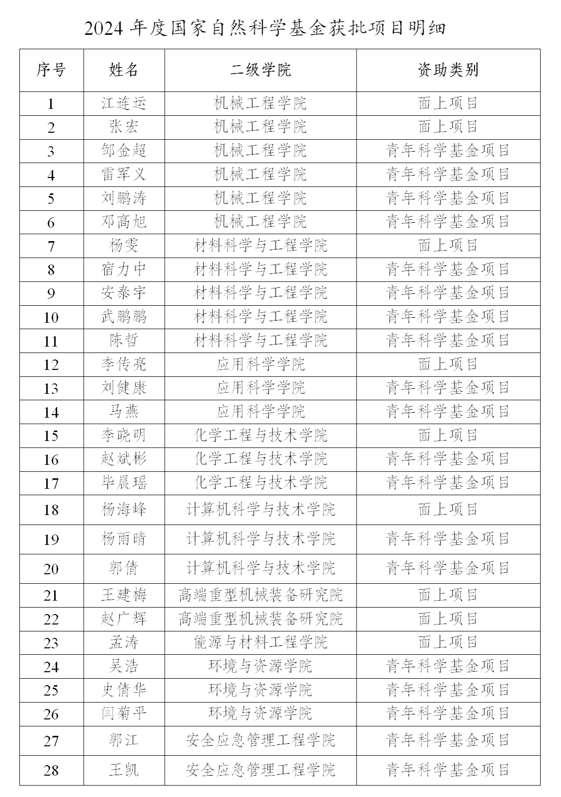 本次获批项目中,机械工程学院6项,占21.43%;材料科学与工程学院5项,占17.86%;计算机科学与技术学院、应用科学学院、化学工程与技术学院、环境与资源学院均为3项;安全与应急管理工程学院与高端重型机械装备研究院各2项;能源与材料工程学院1项。