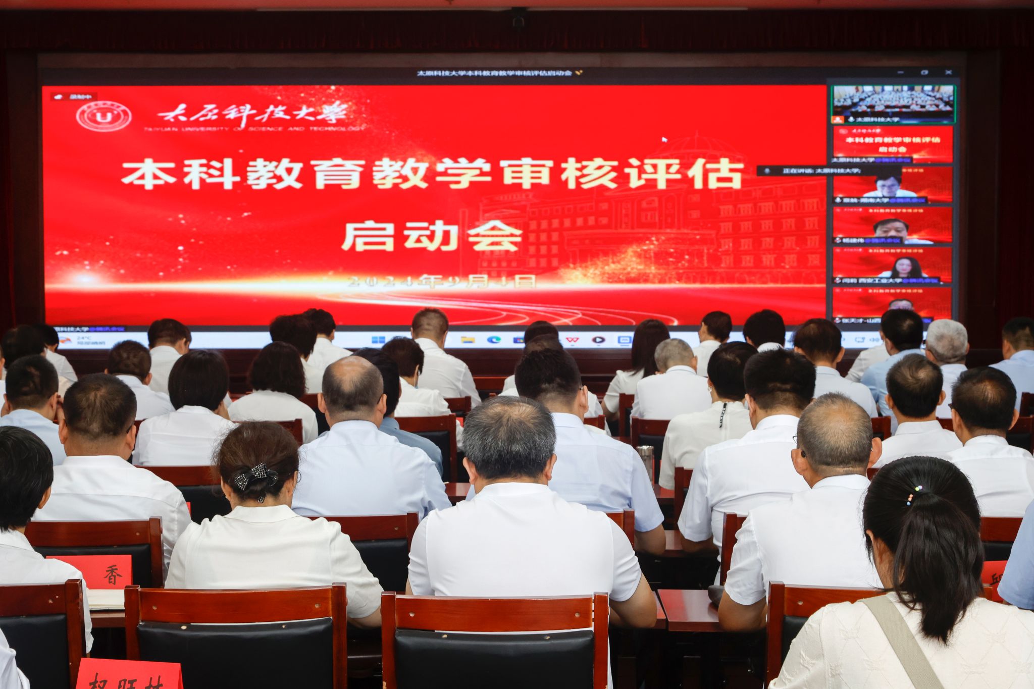 学校其他在校校领导、各职能部门负责人、各学院领导班子、审核评估办公室全体成员线下参加会议。