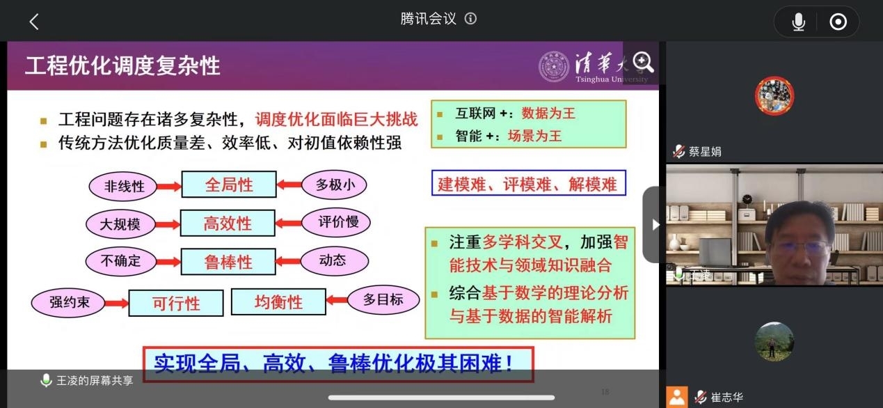 随着新一代信息技术与制造业的深度融合,制造业正在推动优化升级、降本减负,力争实现高端化、智能化、绿色化。鉴于制造系统的大规模、非线性、强约束、多目标、不确定等诸多复杂性,在本次报告中,王教授对复杂智能制造系统调度优化方法进行了详细讲解,并指出模型分析与数据解析的融合、知识驱动与群体智能的协作、机器学习与运筹优化的协同,有望成为复杂智能制造系统调度优化方法设计的有效途径。讲座结束后,在线师生进行了热烈的讨论。