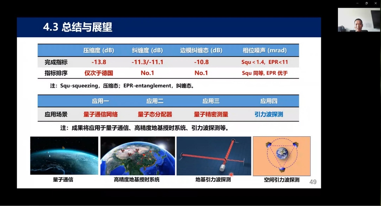 郑耀辉教授首先从量子光源的研究背景出发,结合量子光源在引力波探测器研制过程中的应用,围绕“压缩态光场”和“纠缠态光场”两个研究内容,系统讲解了两种量子光源制备与应用相关的前沿理论与实验技术,并在总结与展望中详细介绍了量子光源的应用前景。