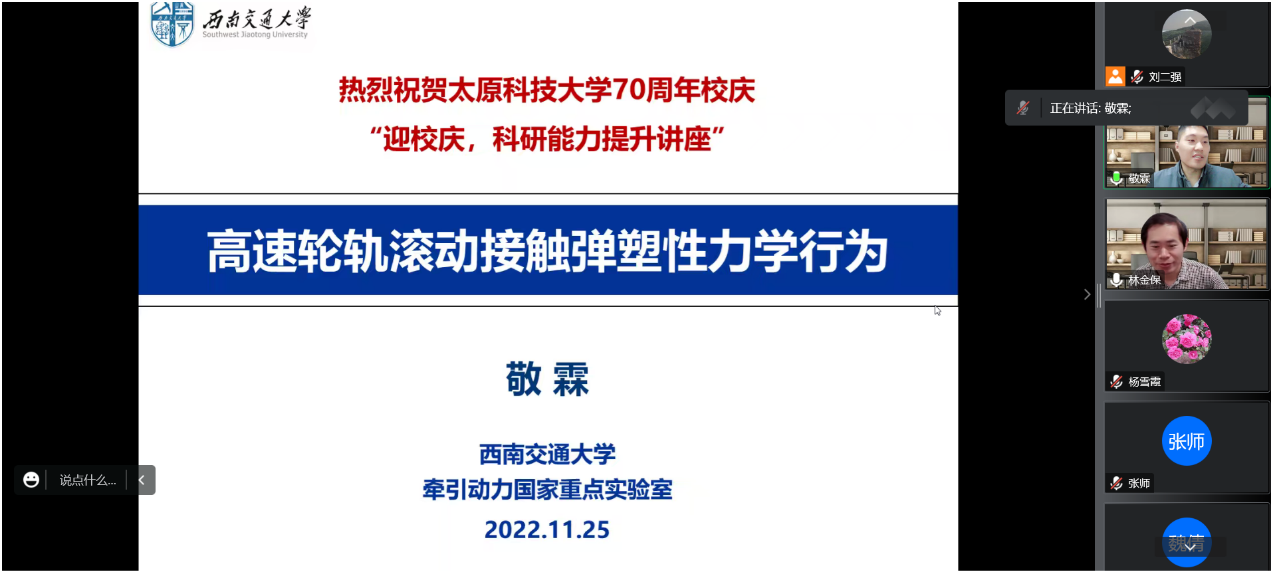 2022年11月25日,pp电子游戏平台官网应用科学学院成功举办“迎校庆,科研能力提升系列讲座”专题报告会。报告会由pp电子游戏平台官网党委宣传部、科学技术研究院主办,应用科学学院承办,邀请到西南交通大学牵引动力国家重点实验室国家优秀青年基金获得者敬霖研究员在线上作了题为《高速轮轨滚动接触弹塑性力学行为》的精彩学术报告。