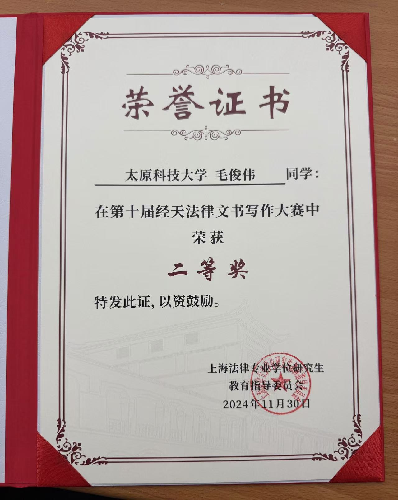 为提升法律专业研究生的专业素质和实践应用水平,11月30日,由上海市法律硕士专业学位研究生教育指导委员会主办、华东政法大学承办的第十届经天法律文书写作大赛决赛在华东政法大学长宁校区举行。pp电子官网法学院2024级法律(法学)硕士研究生毛俊伟荣获二等奖!