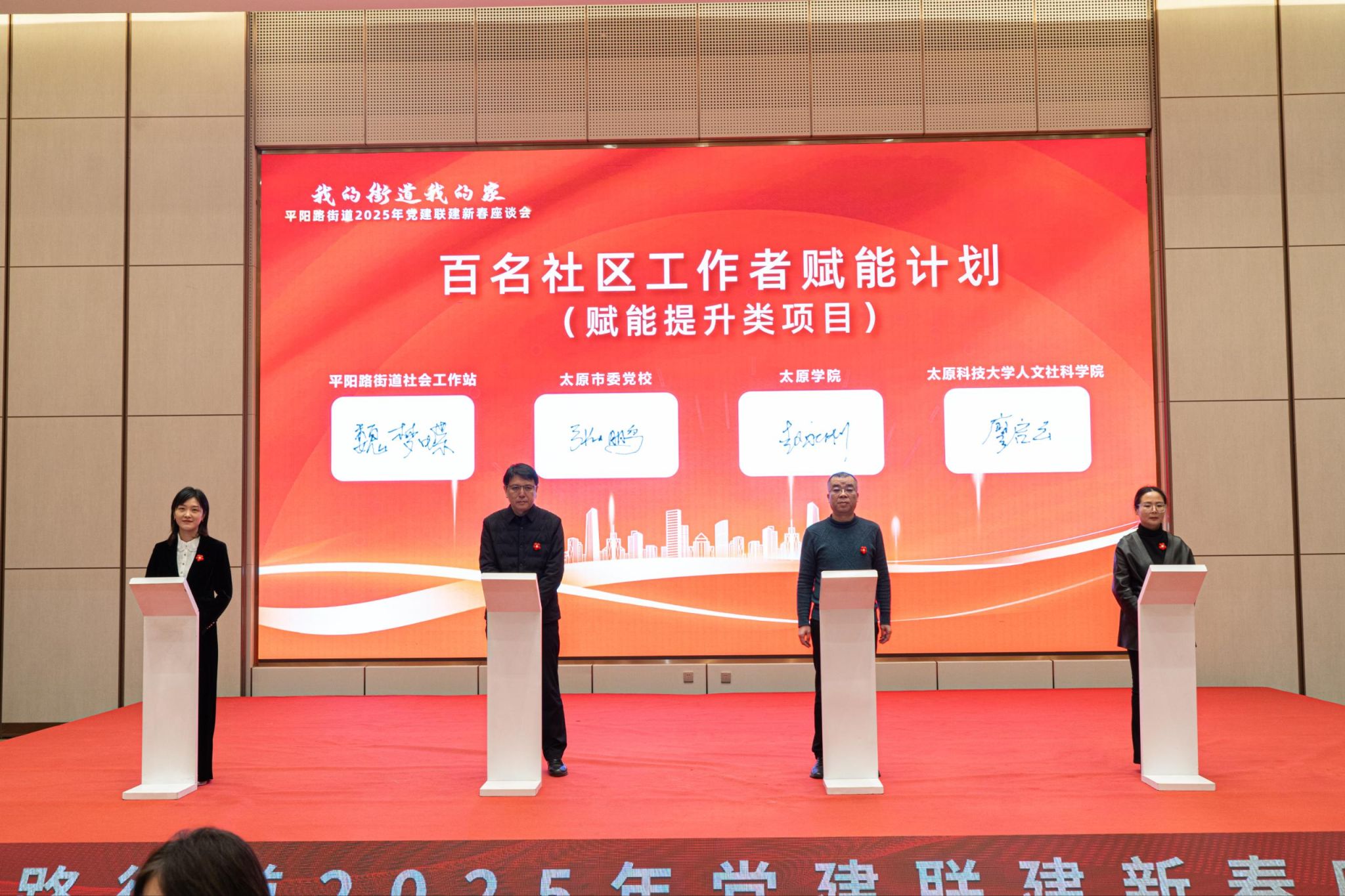 为进一步强化校地合作,深化区域党建融合发展,促进资源共享,1月10日,pp电子官网人文社科学院受邀参加太原市小店区平阳路街道举办的“我的街道我的家”党建联建新春座谈会暨百名社区工作者赋能计划签署仪式。这也是落实pp电子官网与省委社工部签订的战略合作协议的重要举措。区委常委、组织部部长曹旭东、pp电子官网法学院党委副书记兼副院长马文娟以及平阳路街道党政领导班子成员、各社区主干成员等80余人出席。