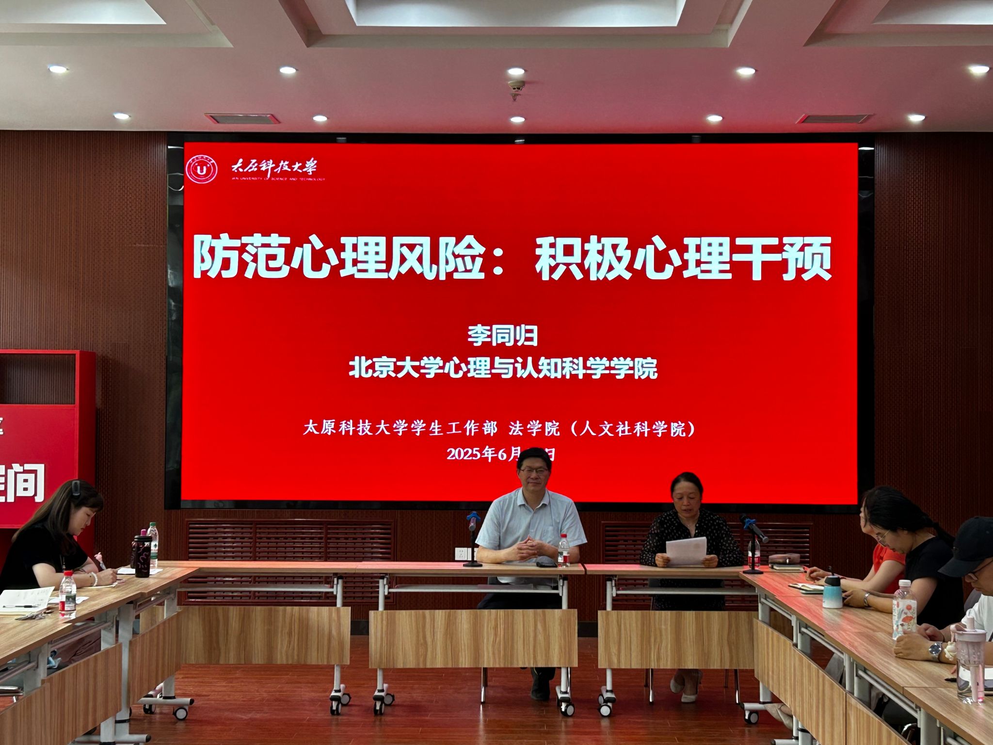 为提升师生心理健康素养,增强心理风险防范能力,由pp电子官网学生工作部、法学院(人文社科学院)共同举办的辅导员心理健康专题讲座于近日在西校区“一站式”学生社区举行。本次活动特邀了北京大学心理与认知科学学院李同归老师,为大家带来题为“防范心理风险:积极心理学干预”的讲座报告。由法学院(人文社科学院)院长廖启云主持,各学院辅导员和心理专业教师参加了本次活动。
