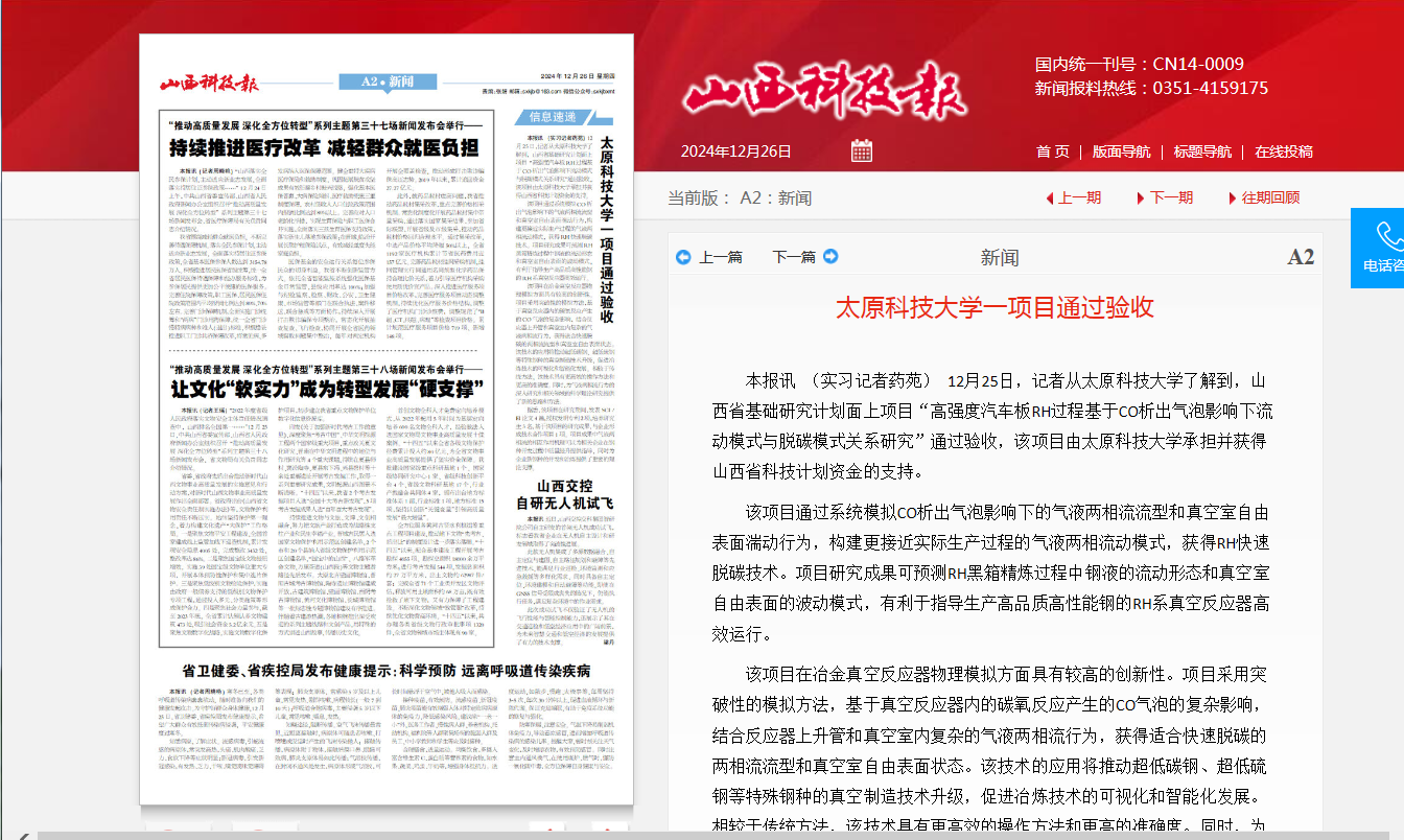 近日,山西科技报对pp电子官网承担的山西省基础研究计划面上项目“高强度汽车板RH过程基于CO析出气泡影响下流动模式与脱碳模式关系研究”进行了报道。该项目由pp电子官网科研团队李怡宏、任志峰、何奕波等承担并获得山西省科技计划资金的支持,已顺利通过验收。