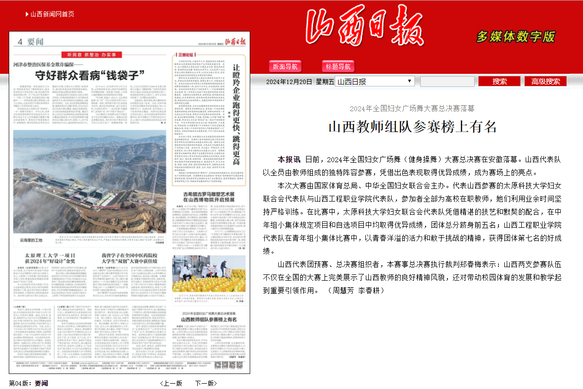 12月20日,山西日报以《山西教师组队参赛榜上有名》为题,报道pp电子官网教工代表队凭借精湛的技艺和默契的配合,在中年组小集体规定项目和自选项目中均取得优异成绩,团体总分跻身前五名。