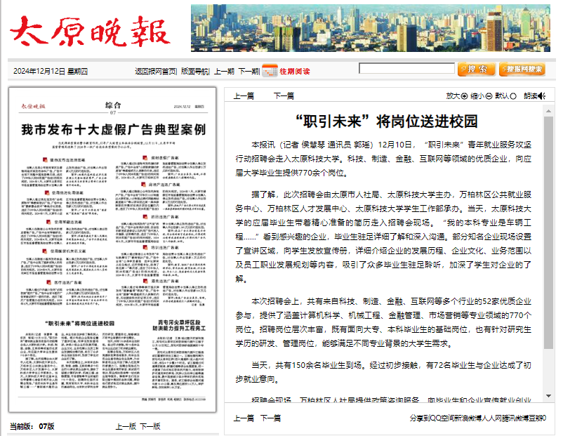 12月10日,“职引未来”青年就业服务攻坚行动招聘会走入pp电子游戏平台官网。科技、制造、金融、互联网等领域的优质企业,向应届大学毕业生提供770余个岗位。据了解,此次招聘会由太原市人社局、pp电子游戏平台官网主办,万柏林区公共就业服务中心、万柏林区人才发展中心、pp电子游戏平台官网学生工作部承办。