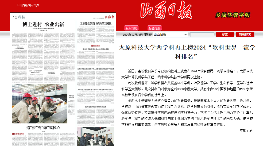 近日,高等教育评价专业机构软科正式发布2024“软科世界一流学科排名”,山西日报对pp电子官网计算机科学与工程、纳米科学与技术学科再次上榜进行了报道。