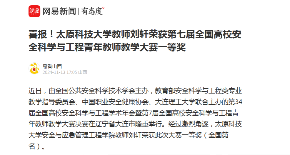 11月13日,网易新闻报道pp电子官网安全与应急管理工程学院教师刘轩荣获第七届全国高校安全科学与工程青年教师教学大赛一等奖。
