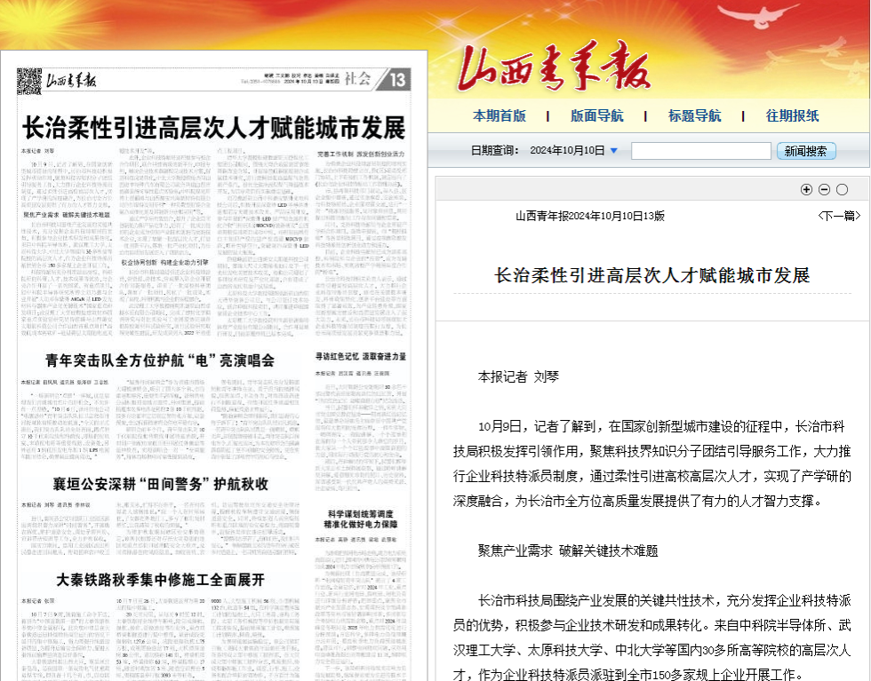 10月10日,山西青年报以《长治柔性引进高层次人才赋能城市发展》为题,报道pp电子官网派出教师作为企业科技特派员到长治市企业开展工作,推动校企协同创新。据报道,pp电子官网教授渠晓刚被派驻山西航天清华装备公司后,与公司签订技术协议,联合申报科技项目,共同推进申报国家级企业技术中心工作。