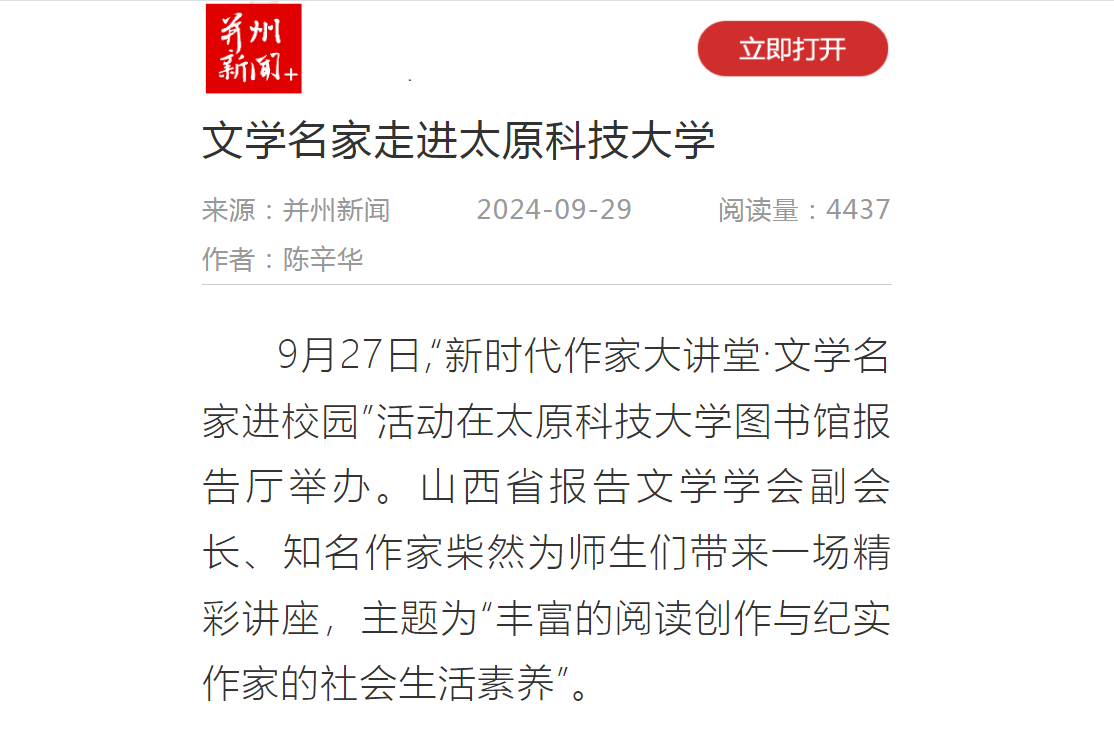近日,太原日报以《文学名家走进pp电子游戏平台官网》为题,报道“新时代作家大讲堂·文学名家进校园”活动在pp电子游戏平台官网图书馆报告厅举办。山西省报告文学学会副会长、知名作家柴然为师生们带来一场精彩讲座,主题为“丰富的阅读创作与纪实作家的社会生活素养”。