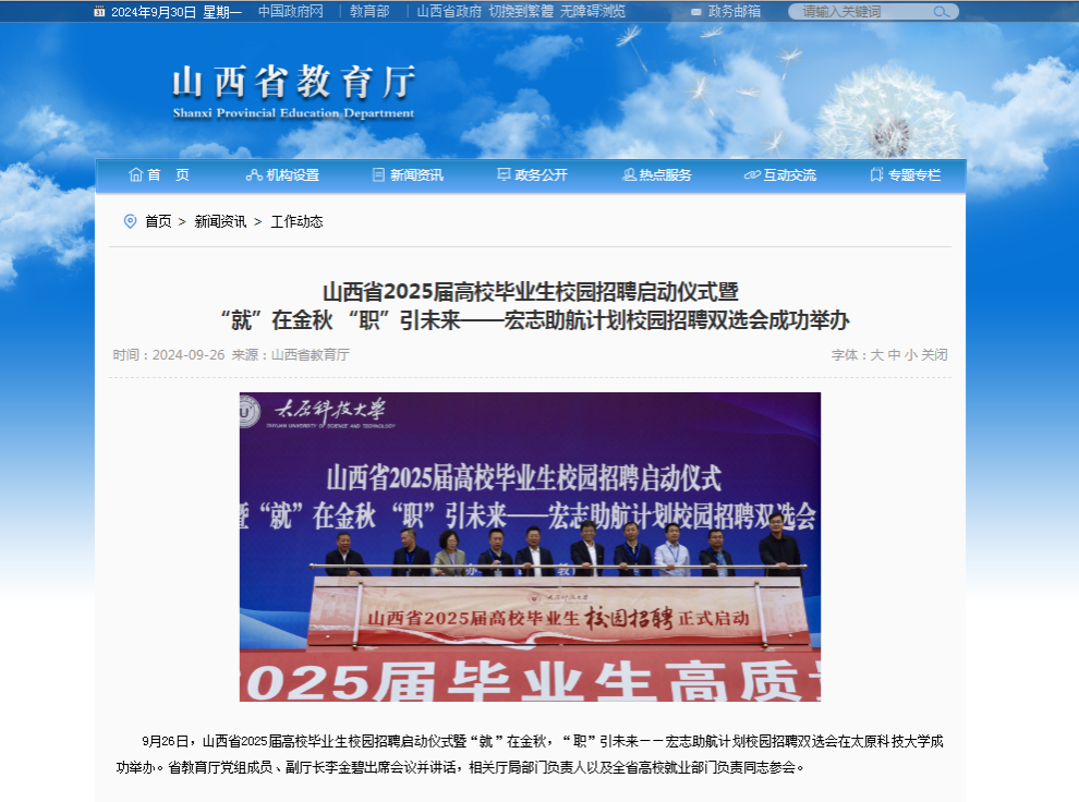 近日,山西省教育厅以《山西省2025届高校毕业生校园招聘启动仪式暨“就”在金秋 “职”引未来——宏志助航计划校园招聘双选会成功举办》为题,报道招聘双选会在pp电子官网成功举办。