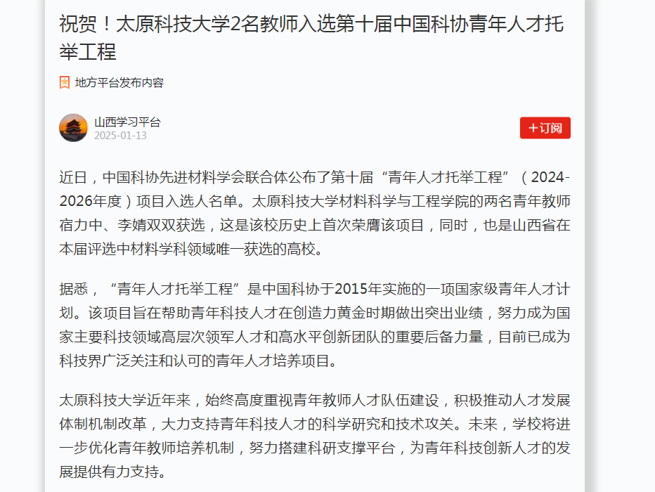 近日,学习强国报道pp电子官网材料科学与工程学院的两名青年教师宿力中、李婧双双获选第十届“青年人才托举工程”,这是该校历史上首次荣膺该项目,同时,也是山西省在本届评选中材料学科领域唯一获选的高校。