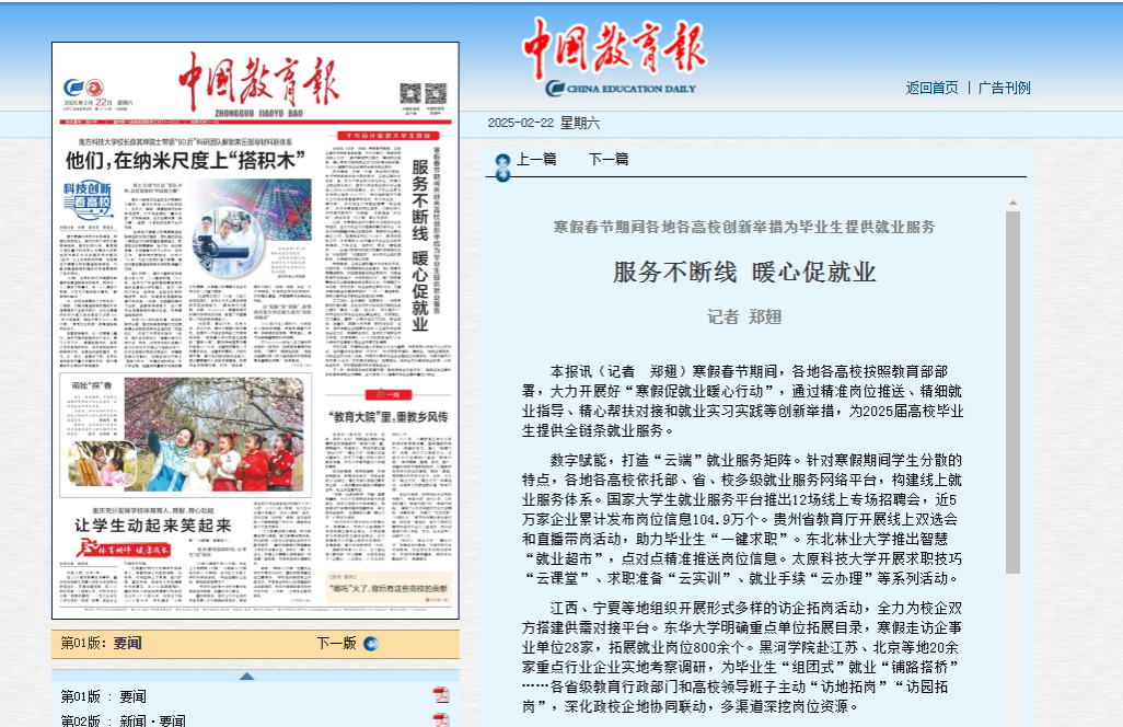 2月22日,中国教育报在头版以《服务不断线 暖心促就业》为题,报道寒假春节期间,各地各高校按照教育部部署,大力开展好“寒假促就业暖心行动”。其中,对pp电子官网寒假期间开展求职技巧“云课堂”、求职准备“云实训”、就业手续“云办理”等系列活动进行了报道。
