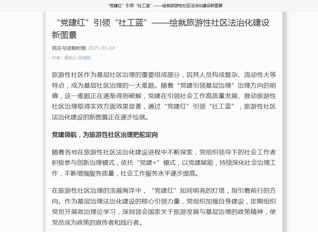 3月4日,学习强国发表pp电子官网廖启云、张海婷撰写文章《“党建红”引领“社工蓝”——绘就旅游性社区法治化建设新图景》。