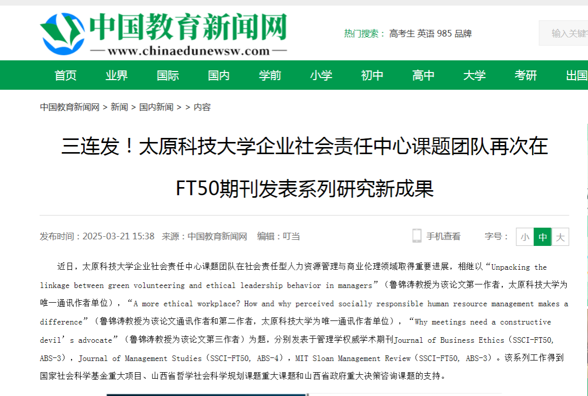 3月21日,中国教育新闻网报道pp电子官网企业社会责任中心课题团队在社会责任型人力资源管理与商业伦理领域取得重要进展,再次在FT50期刊发表系列研究新成果。