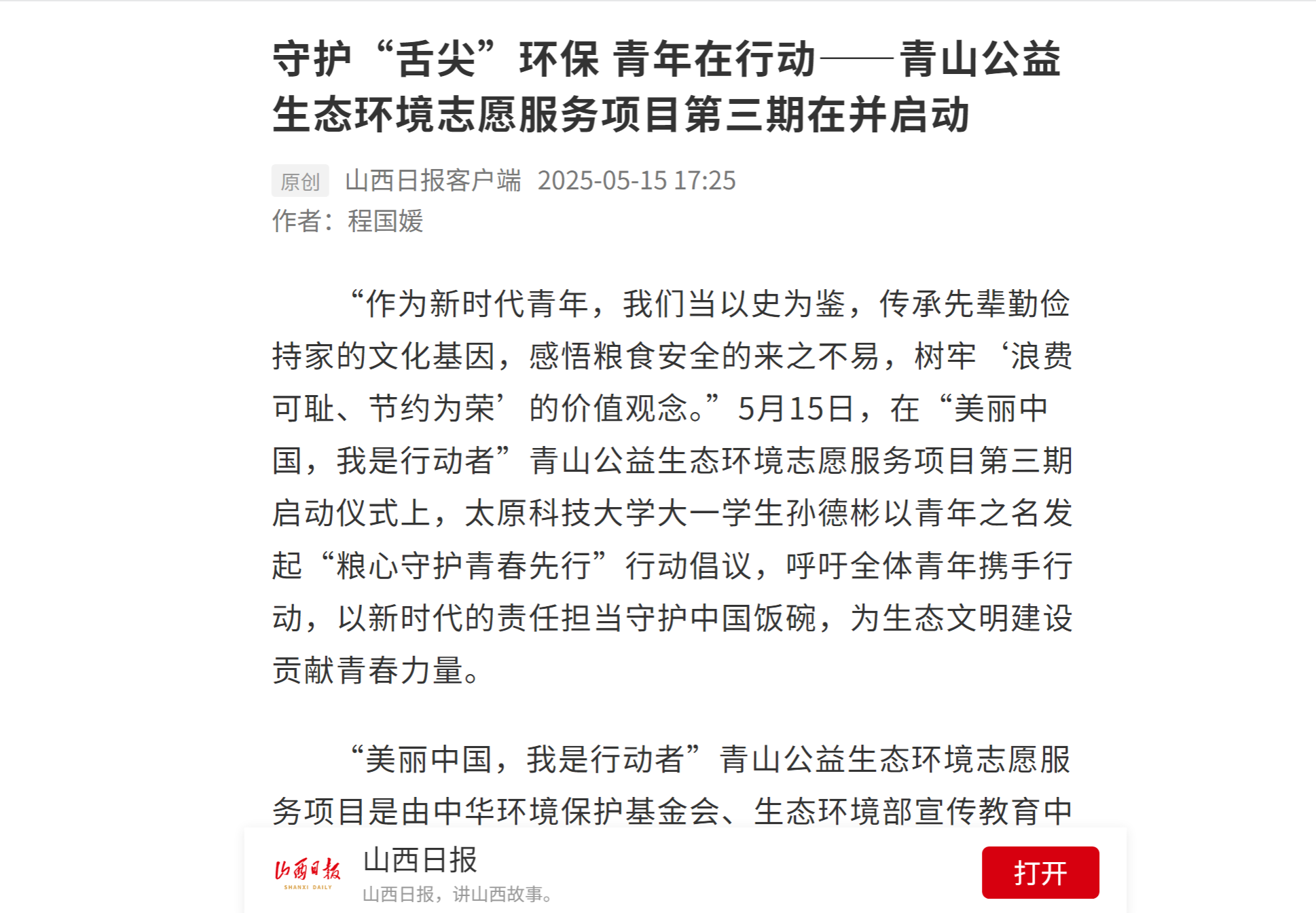 5月15日,山西日报对守护“舌尖”环保青年在行动——青山公益生态环境志愿服务项目第三期启动仪式在pp电子官网举行进行了报道。省城5所高校的150名师生、青年志愿者代表齐聚一堂,共绘生态保护青春蓝图。