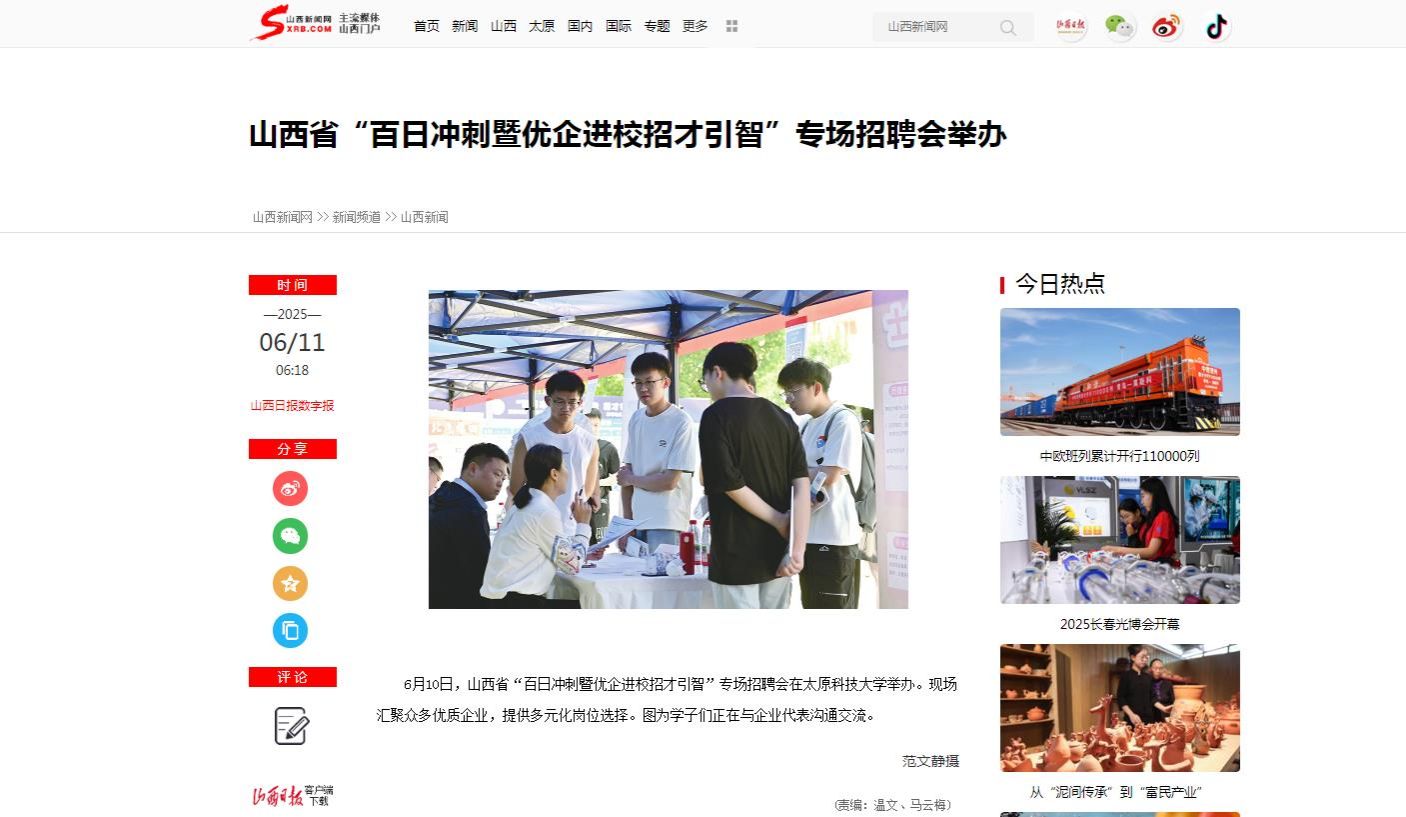 6月10日,山西省“百日冲刺暨优企进校招才引智”专场招聘会在pp电子游戏平台官网举办。现场汇聚众多优质企业,提供多元化岗位选择。山西新闻网对该活动进行了报道。
