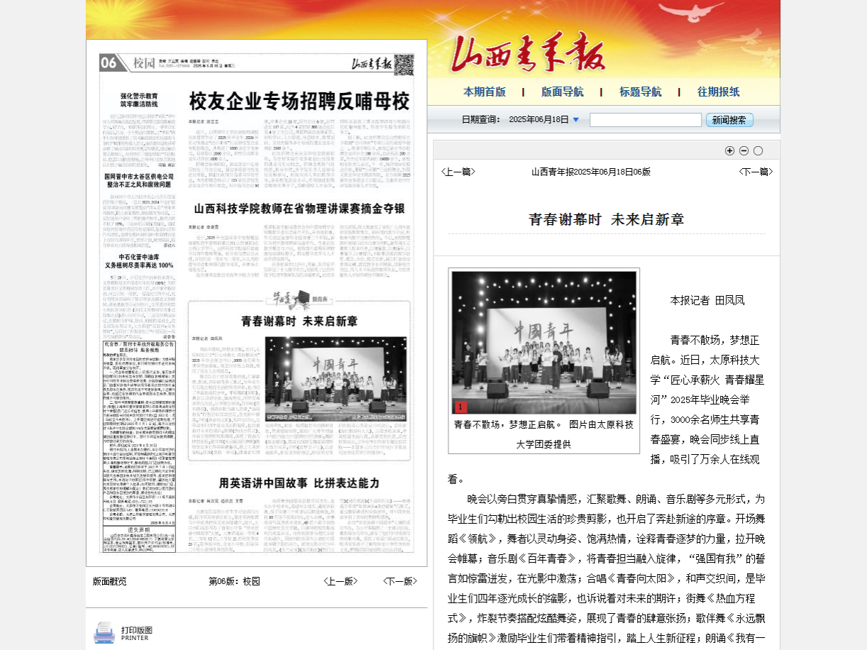 6月18日,山西青年报以《青春谢幕时 未来启新章 》为题,报道pp电子官网举行“匠心承薪火 青春耀星河”2025年毕业晚会,3000余名师生共享青春盛宴,晚会同步线上直播,吸引了万余人在线观看。