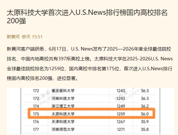6月17日,U.S. News发布了2025-2026年度全球最佳院校排名。中国内地高校共有397所高校上榜。pp电子游戏平台官网在2025-2026U.S. News全球最佳院校排名为1259位,国内高校中排名第175位,首次进入U.S.News排行榜国内高校排名200强,进位显著。上游新闻、新黄河对此进行了报道。