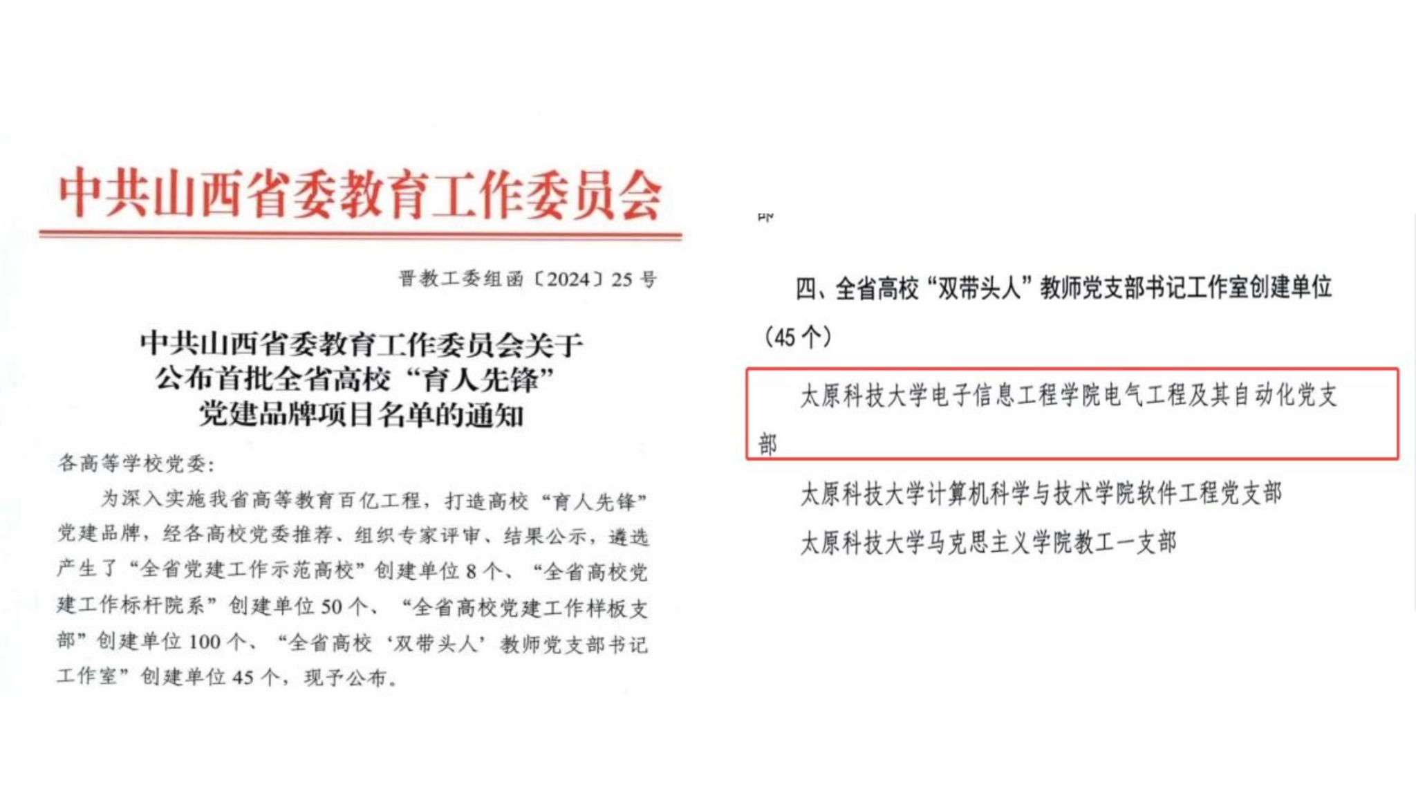2024年山西省委教育工委公布了教育系统党建创新案例评选结果,学院党委《“VR+党建”,科技赋能党建工作》成功入选全省高校党建创新案例。在山西省高校“育人先锋”党建品牌项目中,学院电气工程及其自动化党支部入选全省高校“双带头人”教师党支部书记工作室创建单位。在pp电子游戏平台官网百亿工程新时代高校党建示范创建和质量创优项目、“双带头人”培育项目中学院入选3项,学院党委入选党建工作标杆院系、电气工程及其自动化教师党支部入选“双带头人”教师党支部书记工作室创建单位,研究生第三党支部入选党建工作样板支部。