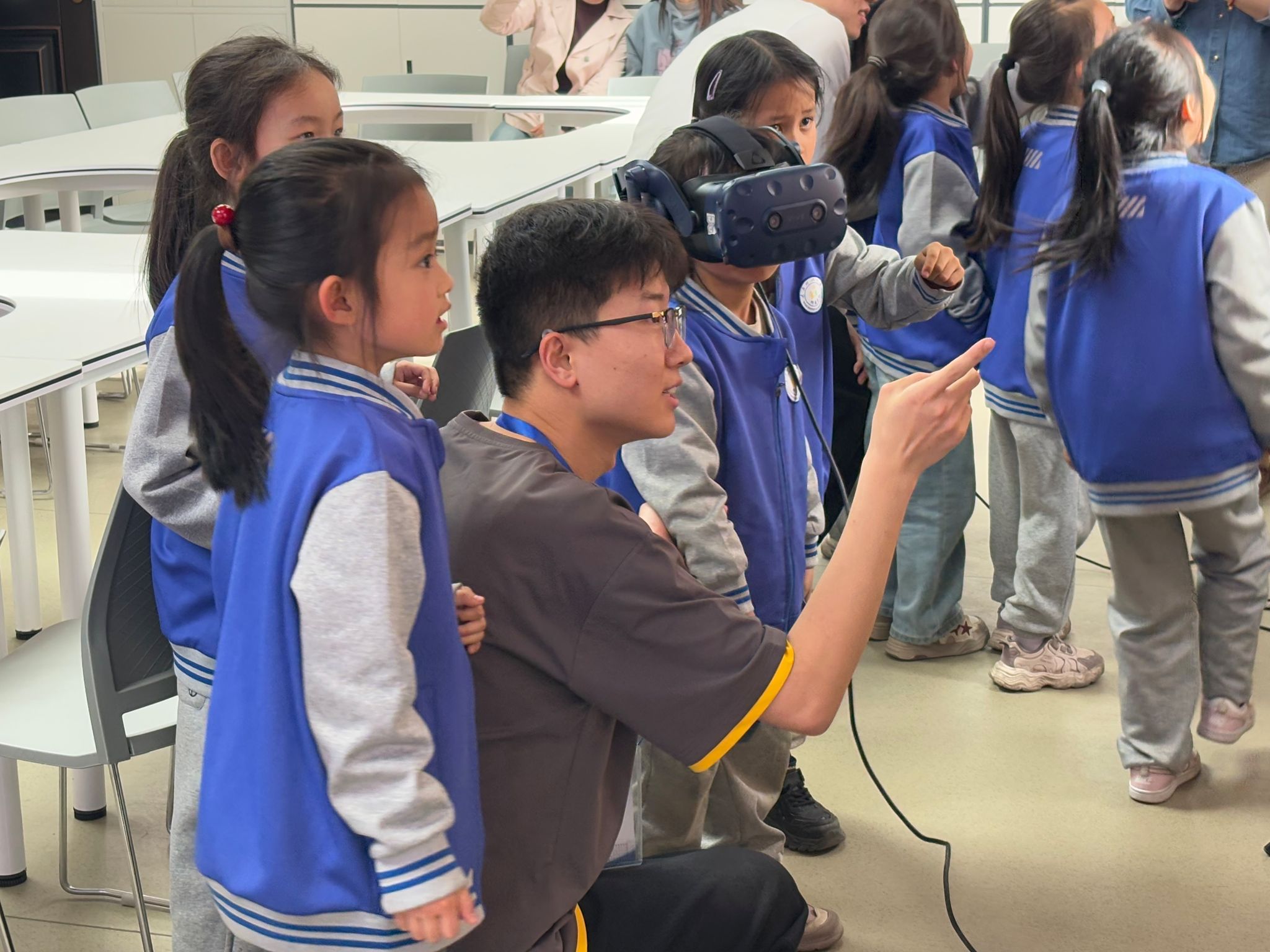 在铭东楼4层的VR +应急指挥与演练实验室,一场别开生面的“沉浸式国安・VR危境探秘”开放体验活动拉开帷幕。该活动巧妙融合VR虚拟现实技术与安全知识,为学生们带来了一场前所未有的沉浸式学习体验。学生们仿佛置身于办公场所、图书馆、化工厂、交通安全场景以及矿井等不同环境之中,亲身体验消防灭火、逃生自救等消防安全知识以及应急救援自救等技能。此次VR活动共开放8场次,吸引了近200名在校大学生参与。与此同时,学院还面向pp电子游戏平台官网附属小学、附属幼儿园开展了3场次“应急体验馆大冒险”主题安全教育活动,专业师生团队引导孩子们感受从识别风险信号到安全撤离的完整流程。活动中,还借助人体模型生动演示了心肺复苏、伤口消毒包扎等急救技能,帮助孩子们建立基础安全意识和应急反应能力,让他们在趣味体验中收获了宝贵的安全知识。