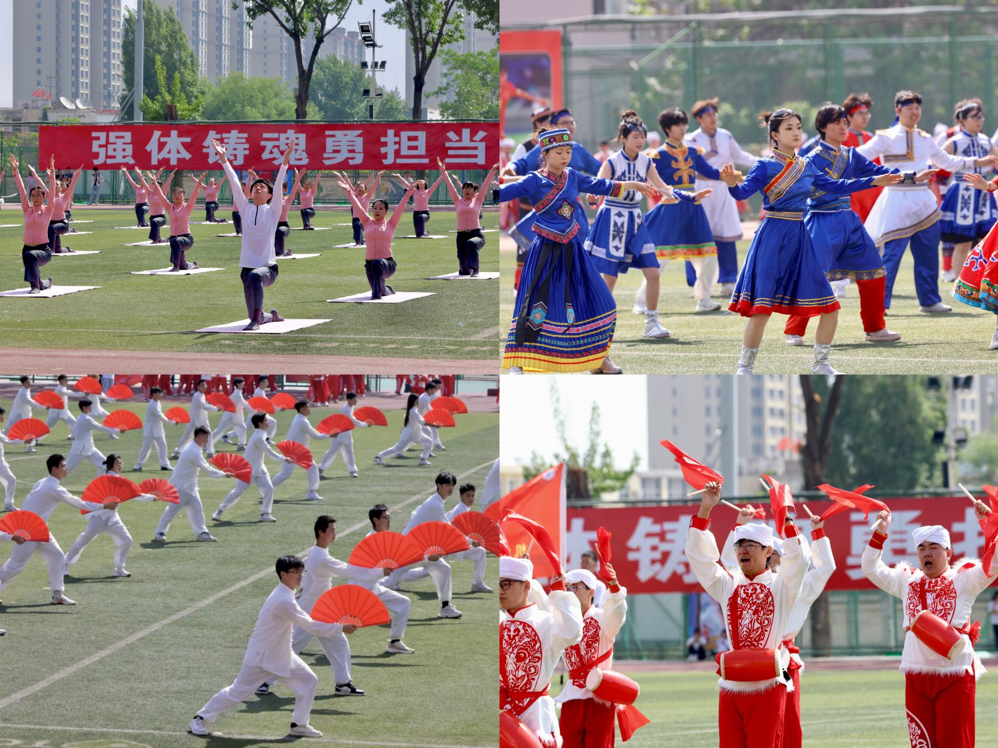在团体操表演中,舞龙舞狮动作矫健、威风凛凛;教工瑜伽刚劲与柔美交织,尽显老师们自信优雅的风采;啦啦操活力十足,队形变幻多样;功夫扇表演一招一式精准有力;安塞腰鼓热情澎湃、鼓点激昂;NewMaker智能实训基地航模队带来的飞行表演在空中划出绚丽彩虹轨迹,将开幕式再次引向高潮。