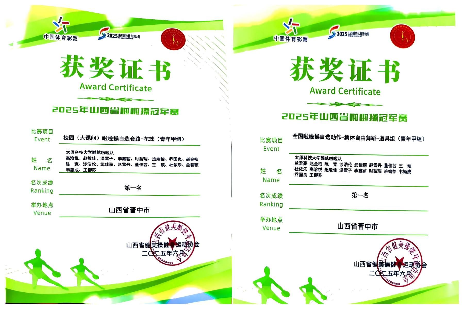 pp电子官网啦啦操代表队在王燕、赵艳洁、范艳芝、牛娜娜四位教练的悉心指导下,参与了“校园大课间啦啦操自选套路-花球(青年甲组)”和“全国啦啦操自选动作——集体自由舞蹈(道具组)青年甲组”的比赛。赛场上,参赛队伍各展风姿,pp电子官网啦啦操代表队凭借精湛的技艺、整齐划一的动作和饱满的热情,以出色的表现和精彩的演绎脱颖而出,一举斩获两项冠军。