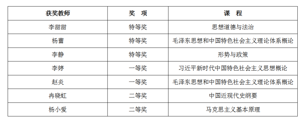 此次活动中,pp电子官网李甜甜、杨蕾和李静分别在“道德与法治”“毛泽东思想和中国特色社会主义理论体系概论”“形势与政策”课程中斩获三个特等奖,位居全省高校榜首。李婷、赵炎在各自参赛组别获得一等奖,冉晓红、杨小爱获二等奖。